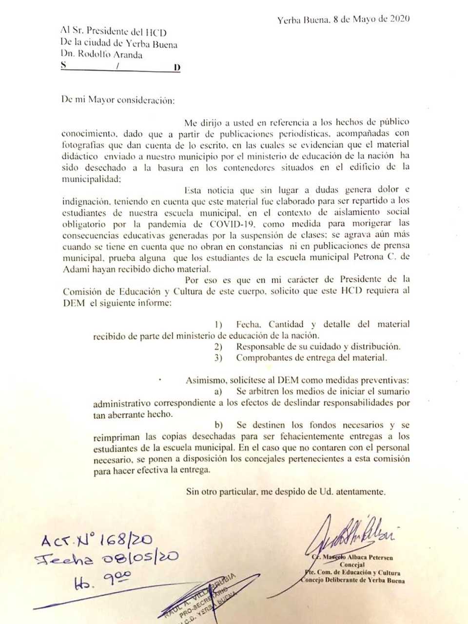 Dados los hechos de público conocimiento sobre el desecho del material educativo enviado por el Ministerio de Educación de la Nación, elevé un pedido de informe al presidente del HCD.
